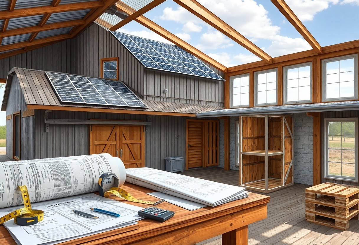 Prioritize high-performance envelopes: structural insulated panels (SIPs) provide R‑23 to R‑40 wall assemblies and can shorten framing time 30-50%. Choose standing-seam metal roofing (40-70 year life) and recycled-steel framing for durability and lower embodied material use. You can integrate reclaimed wood for interiors and size a rainwater tank (1,000-5,000 gallons) for shop washdown. Plan a south-facing roof zone for a 4-6 kW PV array to offset combined shop and living loads.